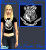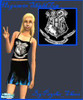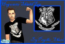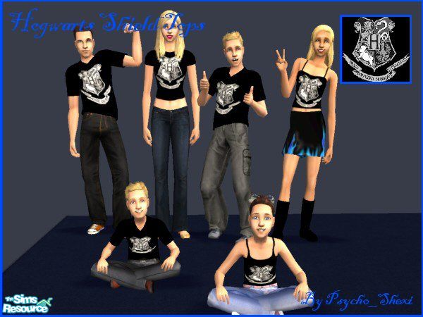 A set of tops for ages child to adult [not including young adult] with the Hogwarts school shield from harry potter on the front.