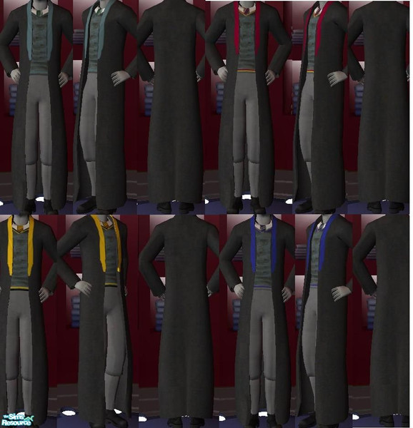 A set of four uniforms, one for each house; Slytherin, Griffindor, Hufflepuff and Ravenclaw.