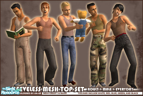 A set of sleeveless mesh tops for adult males. Comes in five different colours: white, green, red, blue, and black. Recolours of a Maxis mesh.