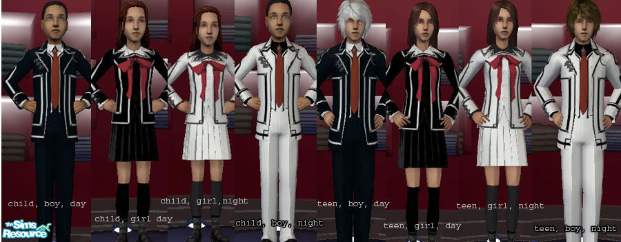 Cross Academy class uniforms, from the manga \"Vampire Knight\". These are for child/teen, boy/girl, day and night classes. These took my forever to make (tried hard to get the perfect). Please enjoy.