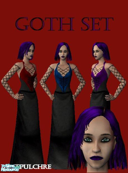 A be the belle of the goth ball with these new gothic style fashions. Dresses come in purple red and blue. Goth hair, lipstick and eyeshadow top it off.