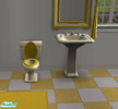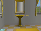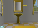 A golden yellow and white bathroom set (matches Maxis' yellow-and-white checkered floor). Includes complete golden yellow recolor of the tub, cheap pedestal sink, and toilet (which look nice in the game as yellow-and-white); and a yellow and white mirror. Bathmat also available on TSR. All TSRAA.