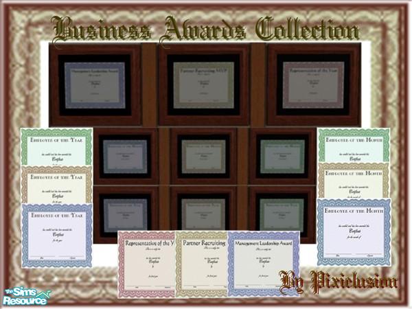 Awards to grace the wall of your sims business or home. Collection includes 9 awards.