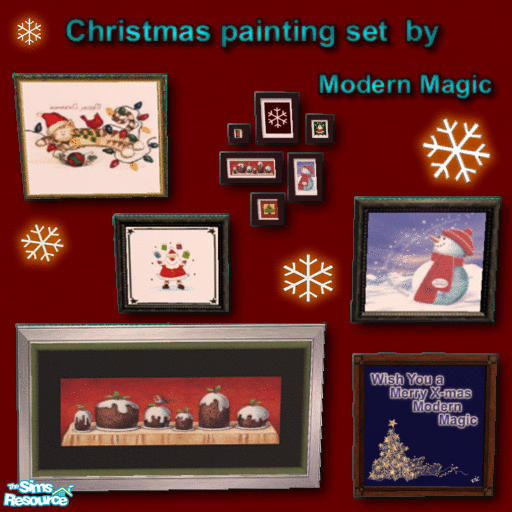 Wake up Your Christmas spirit with this exclusive x-mas paiting set. It contains 6 different hand painted items. ( All the paintings are found under original Maxis paints as recolors, no new meshes. ) Brought to You by : Modern Magic