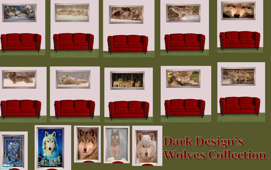This is a collection of 15 wolves on wall hangings. They are either set on "Lady on Red" or "Poisonous Forest..."