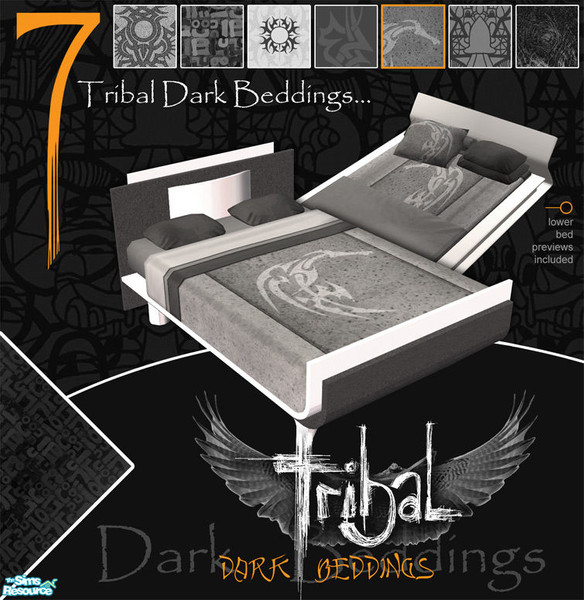 Dark Lovers, exclusive set. Tirbal Beddings in origin but very flexible with any other theme... Extended quilt version... Based on Tribal Dark Theme; SEVEN styles of beddings for your sims... NOTE: Those who are using lower bed, please check the top right corner preview. Enjoy!