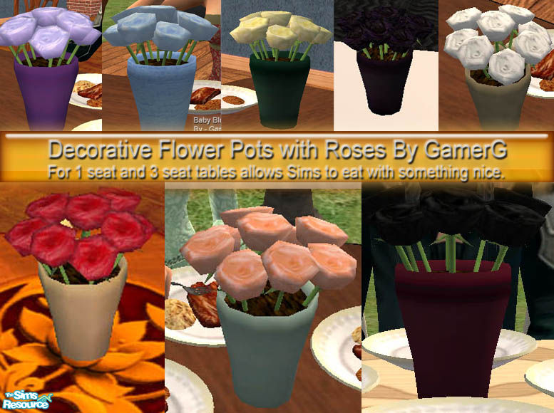 This is a set of 1 new mesh and a few recolors. It is designed for 1 or 3 wide long tables, and allows sims to eat and causes no intersection between them and the table. I hope you like them!