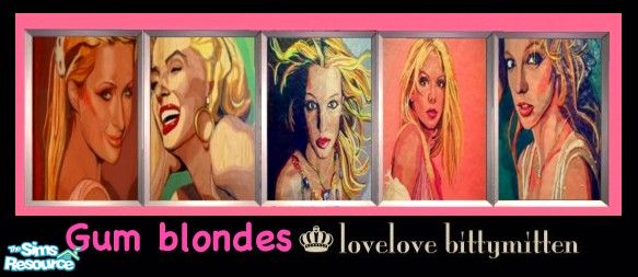 Now your sims can enjoy the gum blondes Britney, Paris and Marilyn on their walls. No EP needed, recolor of Bella on Red.