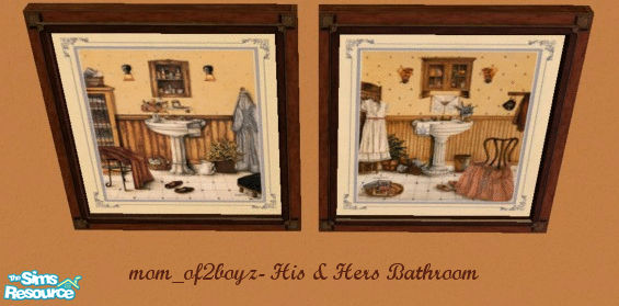 These prints are a recolor of the painting Bella Squared. They each are a version of \"His\" bathroom and \"Her\" bathroom.