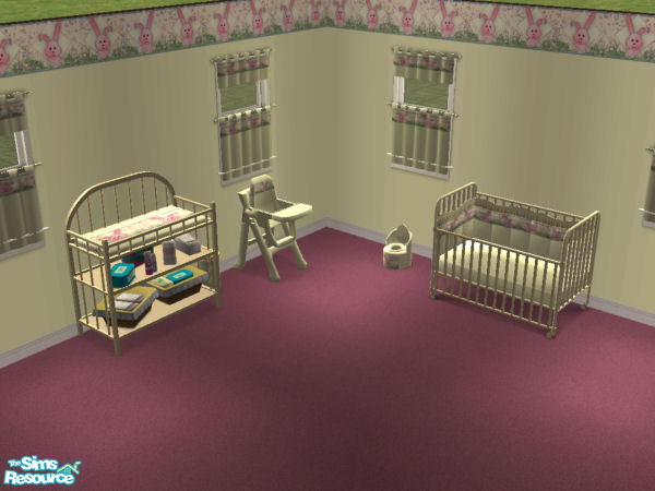 Made to match the "Hopalong" Border on "Paystub Yellow" Paint by Maxis. The nursery includes the crib bedding, changing table, potty, high chair and curtains. The crib frame is one of the Maxis colors.