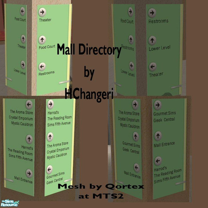 This set is based on a mall directory sign I saw on the net. The store names are based on various retail signs I have created(check my profile) and some that Sims Connection is creating (www.simsconnection.com). You will need Qortex's mesh at MTS2 in order for these to work: www.modthesims2.com/showthread.php?t=45647