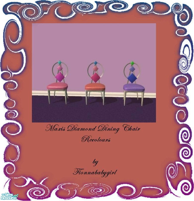 Here are 3 recolours of the Maxis diamondback by desert designs dining chair (light and dark purple as well as blue). Hope you like them, they look great in the game, let me know what you think. by fionnababygirl.