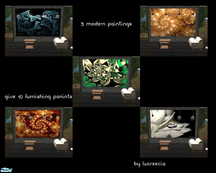 These paintings are my first try working with SimPE. So I hope you will like them. They are based on the maxis mesh "Two dogs an one olive", witch you got with the Nightlife extension. I made them for making modern houses with many withe, gray and black walls more colourfull. I used paintings from ninazdesign, Ultra-Fractal and Wick5ter. This painting give all 10 furnishing points.