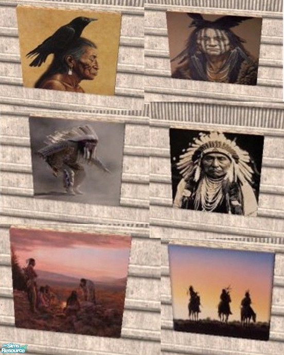 6 Native American Indian prints. Found under the pink canvas painting. 1 tiled. Enviroment 10.
