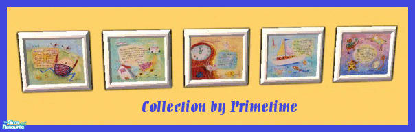 This set contains prints of 5 classic nursery rhymes. They can all be found under The Meaning of Fruit in your game. They are pictured with the frame recolor found right here at TSR.