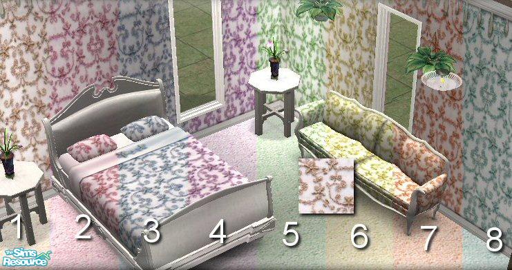Bedding from the Princess Perfection bedroom set. 2 sets include matching beds, sofas, walls, and carpeting. Walls and carpeting tile seamlessly. Looks great in game!