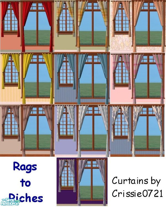 Set of 10 curtains to add personality and charm to any room. These recolors work for both the "Ultra Funky Curtain Clothes" and the "Loft Curtains by Sparse and Fine" Enjoy!! :o)