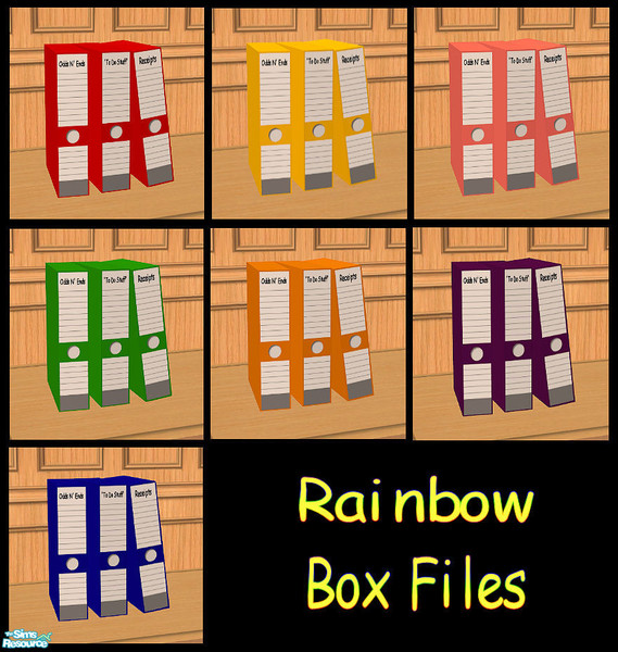 Do your Sims keep misplacing important paperwork? Is their paperwork for their businesses scattered everywhere when it should be hidden away safely? This colourful set of Box Files will keep all of those loose bits of paper neat and tidy. These only require one (any) expansion pack to work.