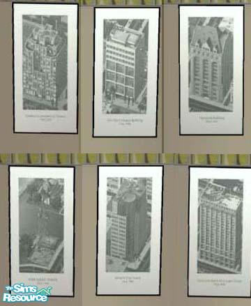 Is your Sim obsessed with skyscrapers or quality architecture. Then they Must adorn their walls with this fine collection of Black and White Quality stills of Sim City Architecture throughout the ages. Comes framed enscribed with name of Building and year construction was finished and surrounded with white matting. (Recolor of the "Olive Peynter's City Skyscape")