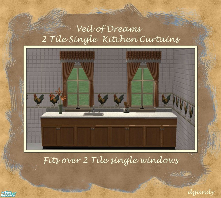 Here are the Veil of Dreams kitchen curtains designed to fit over a 2 tile single window. They pull the textures from the Deluxe Veil of Dreams.