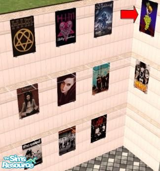Music Inspired Art. All pictures are vertical & 2 tiled. Found under the lady holding the pineapple. (It's by the grilled cheese poster) Enviroment 6. Set includes: Evanescence Band shot, 2 different shots of Amy Lee of Evanescence, 2 different shots of HIM, Kiss, Korn, Nightwish, Rammstein & The Used.