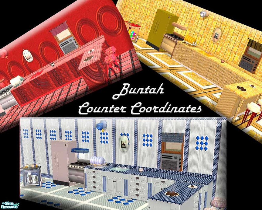 Three sets of colorful matching counters, islands, countertops, walls, and floors. For kitchen or bath.