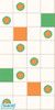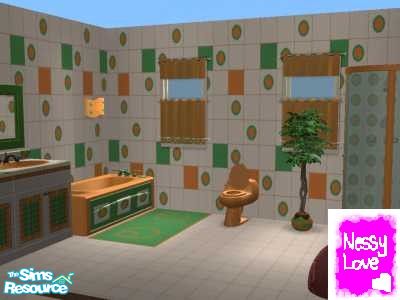 A vividly orange, green and white coloured bathroom set, incorporating a bath, shower, toilet, counter, sink, mirror, wall light, curtains. With wall and floor tiles to match. Sunglasses needed!