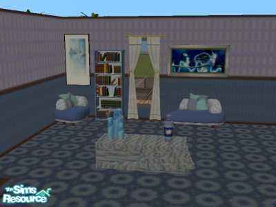 An exquisit set comprising of Coffee table,sofa,bookcase,curtains,2 pictures,vase with flowers,sculptured vase,wallpaper and last but not least a beautiful blue patterned carpet.