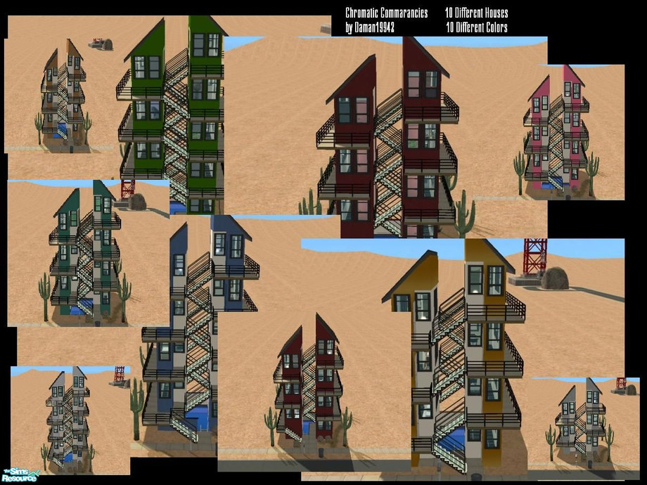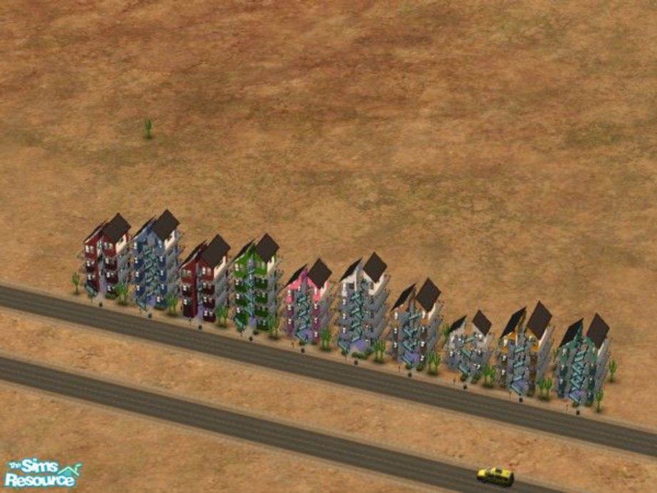 Ten different houses, ten different colors. All the houses are the same style. Prices range from $16,000-$45,000. Each have two beds and one bath. Two single beds. Pool in each.