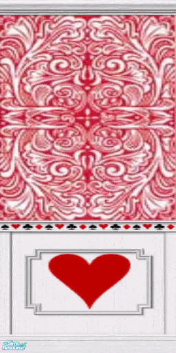This wallpaper features a design based on the backs of Hoyle Maveric playing cards. This version has a heart print in the middle of the wooden pannel, and a row of suit symbols just beneath the wallpaper.