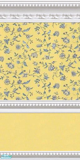 A wainscotted presentation of a country french look in scattered blue and aqua flowers on a yellow ground with a yellow base. Made to coordinate with jsf2WMBRAquaStripe wallpaper and Katcat\'s Cashcraft \"Vintage Charm\" bedroom set.