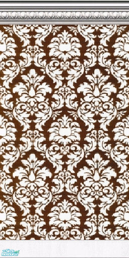 Damask wallpaper with crown and kick molding.