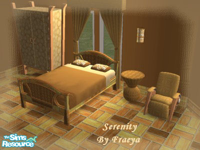 Take a moment and Enjoy the Serenity Life has to offer. With Life flashing by so fast. Let your Sims enjoy a piece of Serenity for a Moment. Collection 1: The Bedroom; includes The Bed, Chair, Dresser, Wall Light, Curtains, End Table, Wall and Floor.