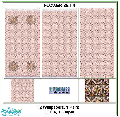 Flower sets include 2 wallpapers, 1 wall paint, 1 floor tile and 1 carpet.