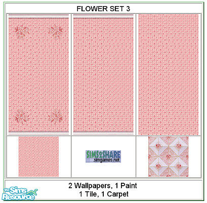 flower3_wall2 Flower sets include 2 wallpapers, 1 wall paint, 1 floor tile and 1 carpet. There are a total of 5 sets in the flower series. Created by Virginia for Sims 2 homes all around Simmy Land Visit web site at http://www.sims2share.simgames.net