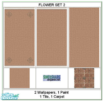 Flower sets include 2 wallpapers, 1 wall paint, 1 floor tile and 1 carpet. There are a total of 5 sets in the flower series.