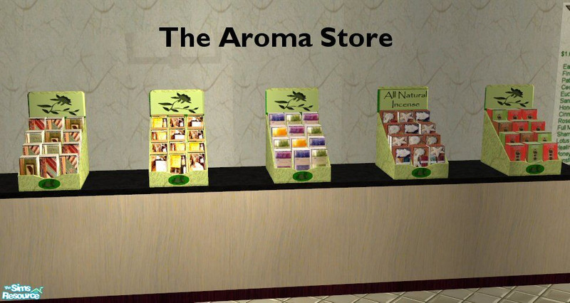 This set was created to go with the Aroma Store signage I created (see my profile). There are 5 displays including: Candles, Incense, Fragrance Kits, and Handmade Journals. Your sims will still purchase the regular games from them.