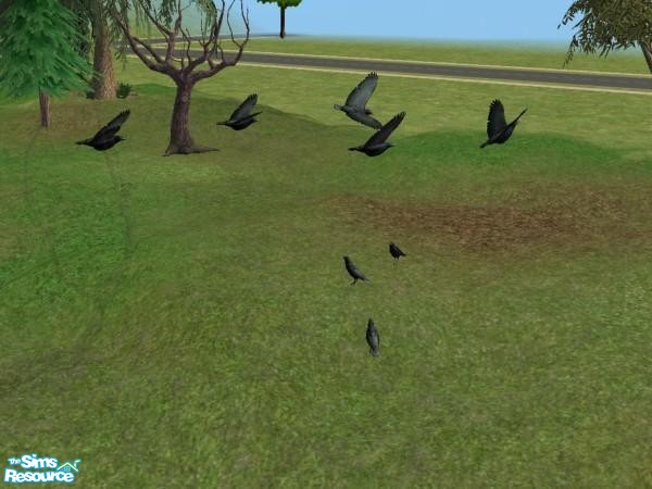 Crows with 6 different poses. All 6 files are mesh files and can be recolored. Standing crow can be placed on a table. Can be used with or without any EP. Standing crow has 1138 polygons, and the flying crows have 1066 polygons. Decorative only.