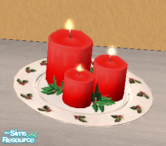 Three red candle pillars on a white with holly border plate and holly accents.