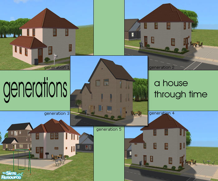 Second set of my lots based on LadyGaia's building challenge. This set includes all 5 stages of the one house going through time and budget. For more info, search for the Generation thread in the building forums. No custom content.