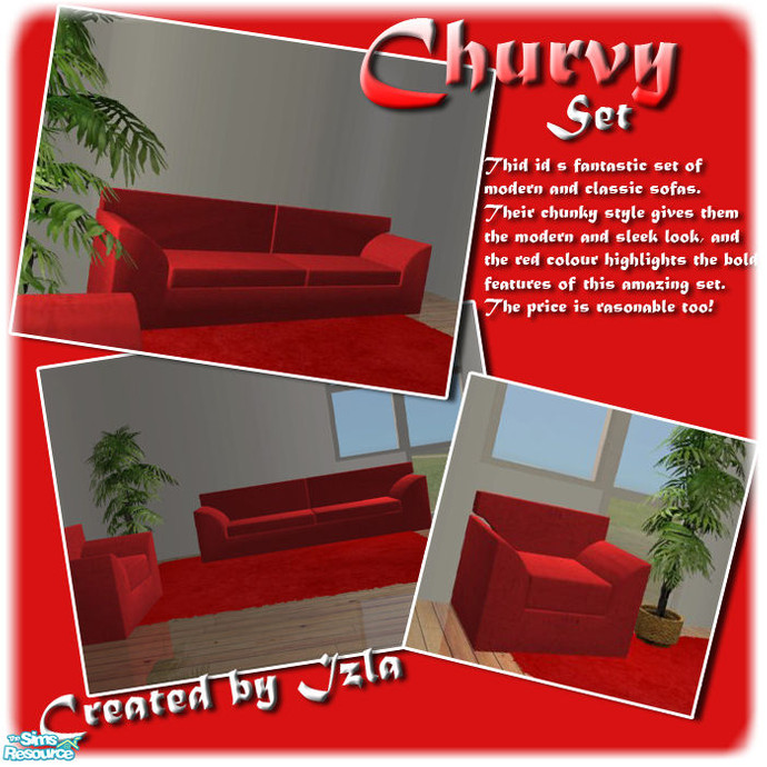 This is a fantastic set consisting of the 3-seater sofa and the single living chair. This funky set would add any life to your Sims' homes or even that little empty room that you can't think of what to put in!