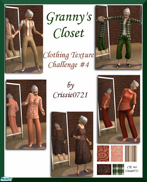 Granny is thrilled to receive 5 new additions to her wardrobe. Using textures provided in the Clothing Texture Challenge #4. Enjoy! :)