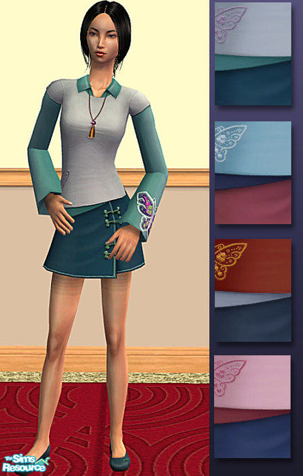 The Teen Female butterfly top & skirt outfit converted to Adult/Young Adult Female. Comes in the original 4 Maxis colours. Includes fat morph & bumpmap enabled.