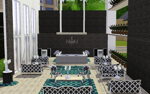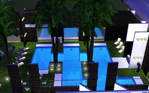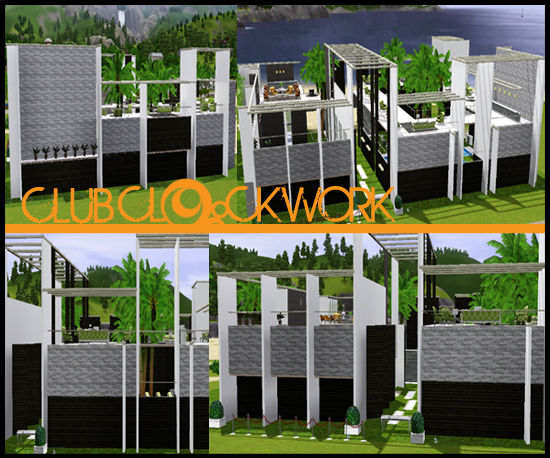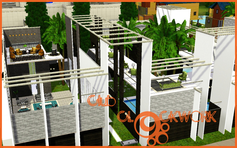 themed bars on three different levels, the Ice Bar on the ground floor serves beautiful chilled cocktails all night long, Deck Bar suspended on the second floor overlooking the pool is the perfect place for your sims to meet friends with sweeping views not only of the ocean but also the pool below, and Clockwork VIP bar located on the top floor overlooking the entire nightclub is for only the most beautiful and popular sims! Club Clockwork never closes! You can enjoy the tropical pool on the ground floor with drinks served to you whilst you tan on the lounges provided!