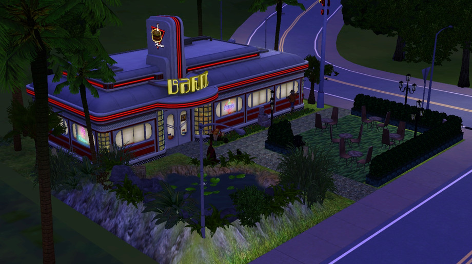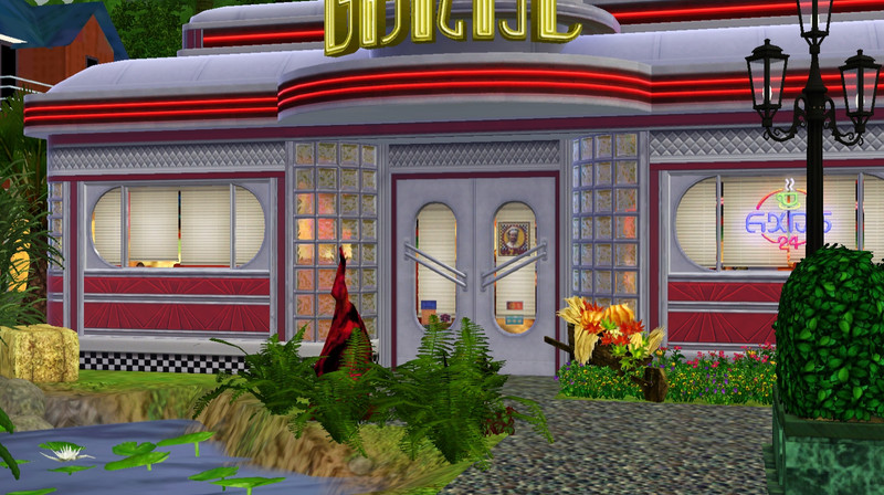 EA's diner has been relocated and updated with a touch of the tropics for outdoor dining with flair. When your Sim is on a budget and needs to take a break from the kitchen, why not meet and eat in the newest diner to hit town square? Lightly decorated in Halloween/fall style.