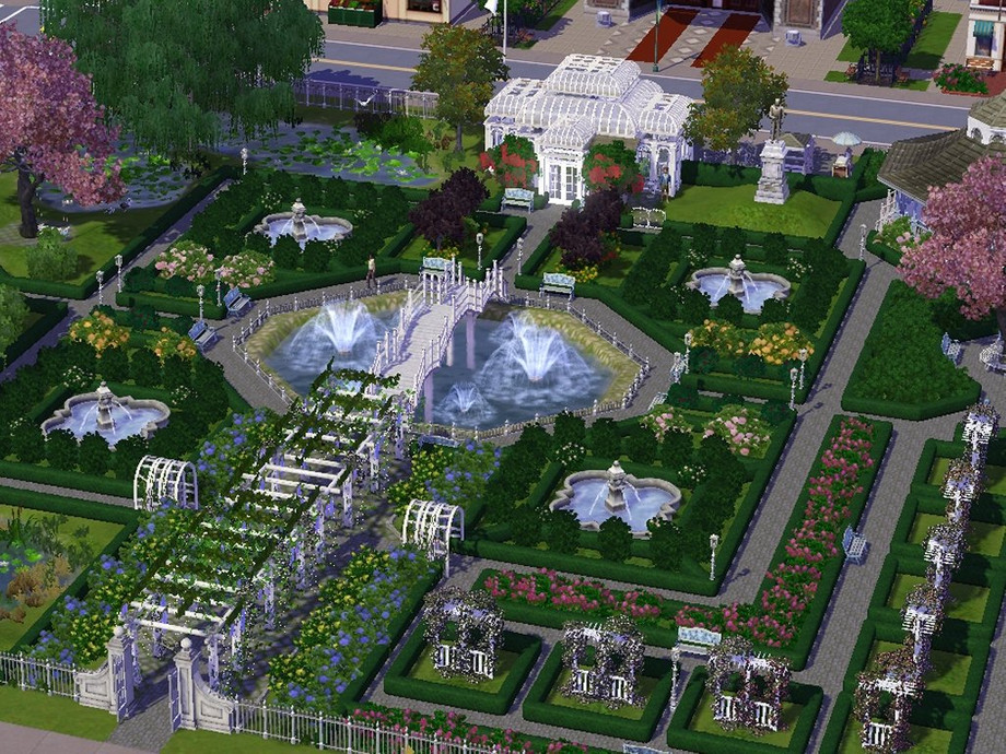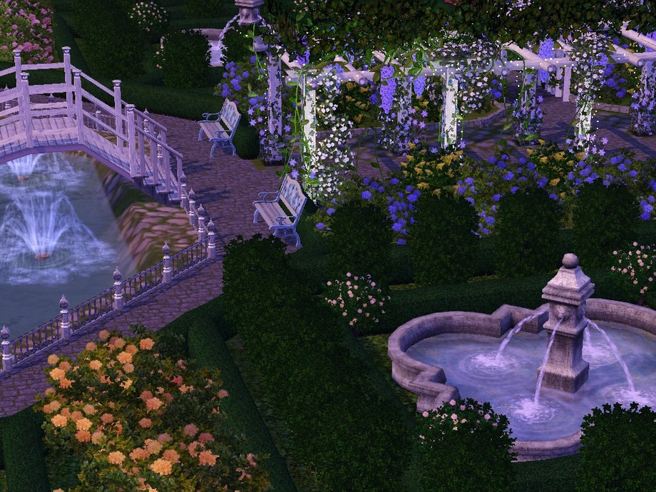 Victorian park: gazebo, conservatory, rose garden, English formal garden, 3-arch Japanese bridge, wisteria pergola, fountains, ponds, playground, picnic area, fire pit, juice bar, hot dog stand, outhouse
