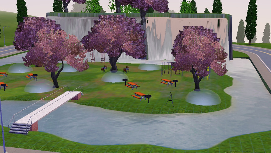 A park with a huge waterfall.