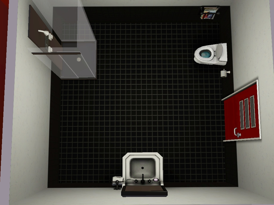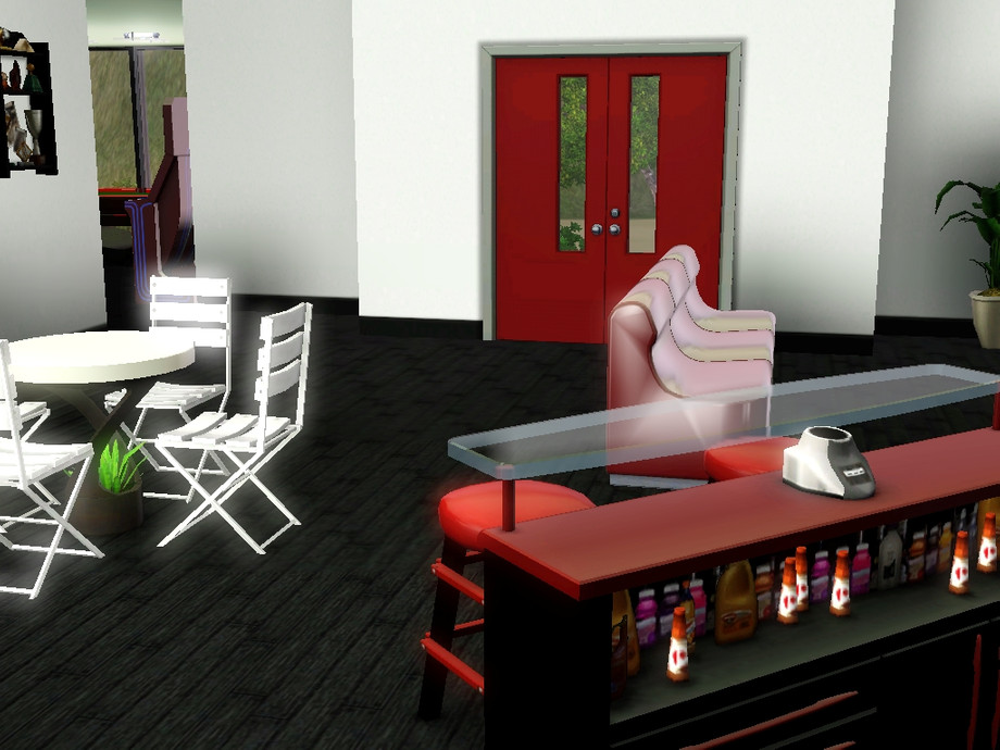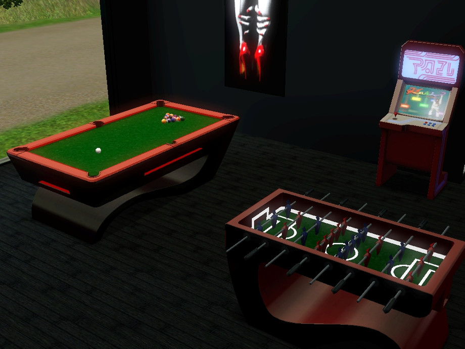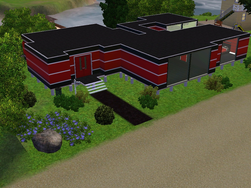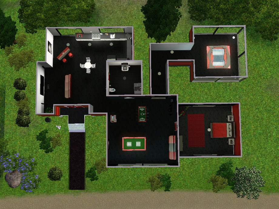 Red, Black & White is the color scheme for this house, it has one bedroom & one bathroom. The rest of the house is open plan, the kitchen has lots of workspace for the men who like to cook, and a games room for the men who like to play!