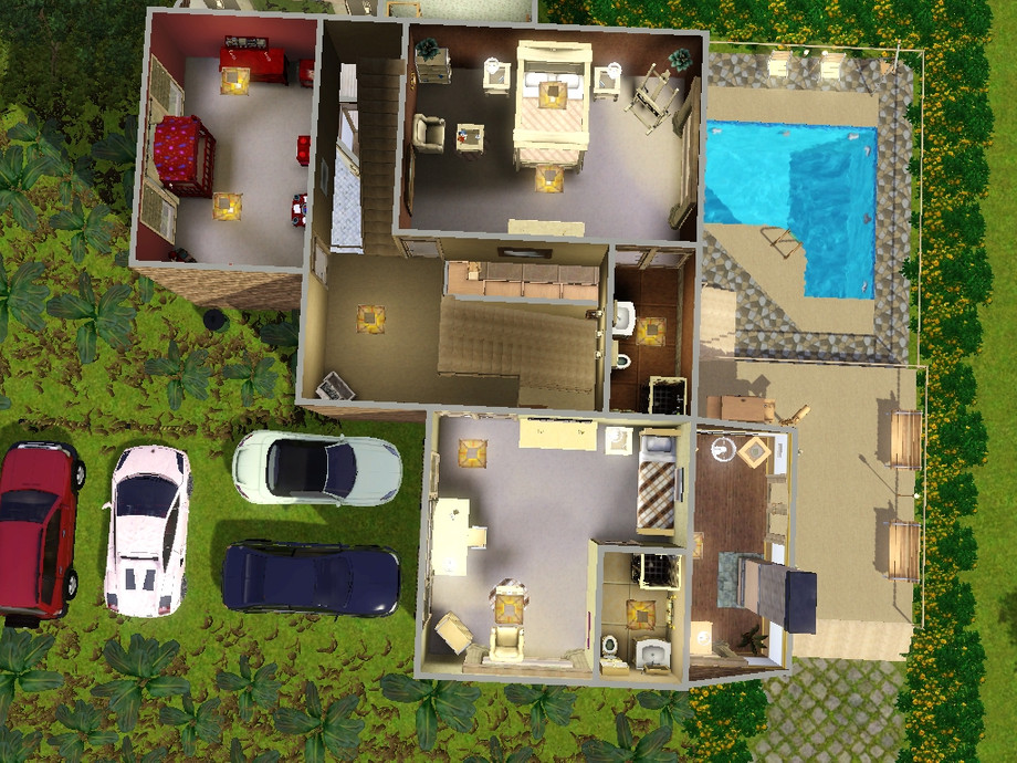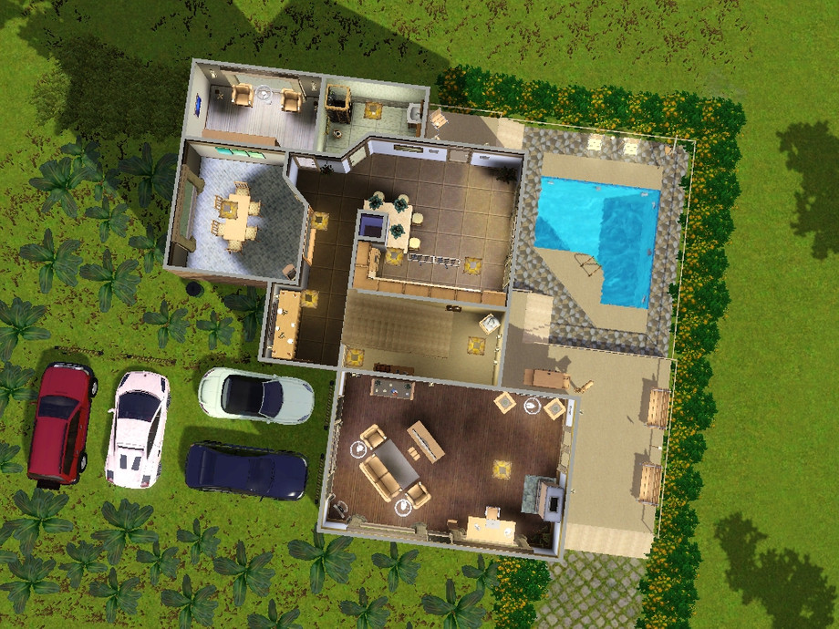 Required: Only the Sims 3 base game. No expansion packs/stuff packs are required. I believe the only CC I have used in this house is two of the cars on the lot. Cheat used: 'moveobjects on'.