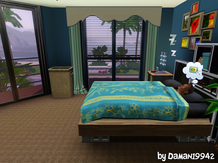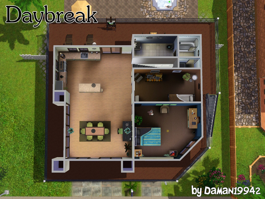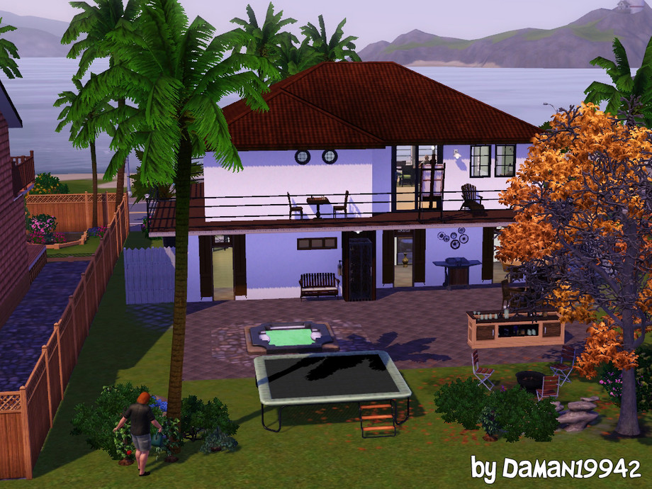 Positioned right across from the beach, this bungalow features an upstairs kitchen and loads of backyard activities. Room for three sims in the two bedrooms. Grill, bar, hot tub, fire pit, trampoline, and outdoor shower are all included in the back.